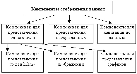 Рис. 18.1. Классификация компонентов отображения данных Компоненты TDBGrid и TDBCtrlGrid обеспечивают просмотр наборов данных целиком или в произвольном сочетании полей. В них присутствует только свойство DataSource. Особенную роль среди компонентов отображения данных играет компонент TDBNavigator. Он не показывает данные и не предназначен для их редактирования, зато обеспечивает навигацию по набору данных. Наиболее часто в практике программирования используются компоненты TDBGrid,TDBEdit И TDBNavigator. Для представления и редактирования информации, содержащейся в полях типа Memo, используются специальные компоненты TDBMето и TDBRichEdit. Для просмотра (без редактирования) изображений предназначен компонент TDBImage. Отдельную группу .составляют компоненты синхронного'просмотра данных. Они обеспечивают показ значений поля из одной таблицы в соответствии со значениями поля из другой таблицы. Наконец, данные можно представить в виде графика. Для этого предназначен компонент TDBChat. Как видите, набор компонентов отображения данных весьма разнообразен и позволяет решать задачи по созданию любых интерфейсов для приложений баз данных. Ввиду общности решаемых задач, компоненты отображения данных имеют несколько важных общих свойств, которые представлены в табл. 18.1 и в дальнейшем изложении опущены. Таблица 18.1. Общие свойства компонентов отображения данных