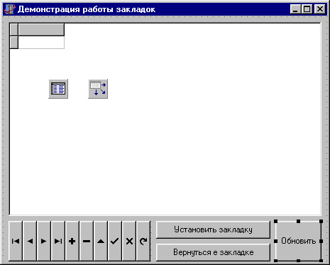 Рис. 18.9. Главная форма проекта DemoBookmark Рассмотрим небольшой пример, где право управлять закладками предоставлено пользователю (рис. 18.9). На форме, помимо других элементов управления (среди которых есть компонент TDBGrid), имеется две кнопки. Кнопка StartBookmark помечает текущую запись, кнопка StopBookmark переходит к закладке, а затем уничтожает ее. Листинг 18.2 Пример использования закладок var SaveRecPos: TBookmark; procedure TFormI.FormShow(Sender: TObject); begin try Tablel.Open; BookmarkControl.Brush.Color := clBtnFace; except ShowMessage('Ошибка открытия набора данных'); end; end; procedure TFormI.FormClose(Sender: TObjeCt; var Action: TCloseAction) ; begin try finally Tablel.Open; end; end; procedure TForml.StartBookmarkClick(Sender: TObject); begin if Not Tablel.BookmarkValid(SaveRecPos) then SaveRecPos := Tablel.GetBookmark; BookmarkControl.Brush.Color := cILime end; procedure TForml.StopBookmarkClick(Sender: TObject); begin with Tablel do begin if Not BookinarkValid( SaveRecPos) then Exit; GotoBookmark(SaveRecPos); FreeBookmark(SaveRecPos); end; BookmarkControl.Brush.Color := clBtnFace; end; Использование метода Bookmarkvalid позволяет корректно переопределять закладку, если она уже установлена, и избежать ошибок при произвольных нажатиях кнопок. Компонент BookmarkControl типа TShape сигнализирует о том, что закладка установлена или удалена. Закладки также используются в компоненте TDBGrid. Он имеет свойство SelectedRows типа TBookmarkList, которое представляет собой список закладок, указывающих на одновременно выделенные записи. Диапазоны В наборе данных, помимо фильтров, имеется еще одно средство отбора записей. Группа методов позволяет на основе использования индексов отбирать в набор данных только те записи, значения индексированных полей которых (для текущего индекса) соответствуют диапазону заданных величин. Диапазоны работают быстрее фильтров, но менее гибки и не так удобны в работе. При использовании диапазонов набор данных обязательно должен находиться в состоянии dsSetKey (см. ниже). Для того чтобы включить диапазон, необходимо задать стартовое и конечное значение диапазона для ключевых полей, затем применить созданный диапазон к набору данных. Работающий диапазон можно модифицировать. Все методы работы с диапазонами используют те поля, которые заданы в текущем индексе. Для таблиц Paradox и dBASE это свойство indexName. Для таблиц серверов SQL это свойство indexFieldNames. Метод setRangeStart переводит набор данных в режим dsSetKey, следующее за этим присваивание ключевым полям означает задание начальной границы диапазона. Метод setRangeEnd также переводит набор данных в режим dsSetKey, следующее за этим присваивание ключевым полям означает задание конечной границы диапазона. После этого необходимо использовать метод ApplyRange, который применяет созданный диапазон к набору данных: with Tablel do begin SetRangeStart; Fields[0].Value := '439'; SetRangeEnd; Fields[1].Value := '522'; ApplyRange; end; Работающий диапазон можно модифицировать аналогичным образом: после вызова методов EditRangeStart и EditRangeEnd необходимо задать новые границы для ключевых полей и снова вызвать метод ApplyRange: with Tablel do begin EditRangeStart; Fields [0] .Value := '500'; EditRangeEnd; Fields[1].Value := '522'; ApplyRange; end; Отмена диапазона осуществляется методом cancelRange. Если индекс содержит несколько полей, то перед вызовом метода ApplyRange необходимо задать значения для всех ключевых полей. Для одновременного задания верхней и нижней границы диапазона можно использовать метод SetRange. with Tablel do begin SetRange(['500'], ['522']); ApplyRange; end; Тем, какая граница будет у диапазона — открытая или закрытая, управляет свойство KeyExclusive. Если оно имеет значение True, граничные значения в диапазон не включаются, в противном случае — включаются. Резюме Компоненты