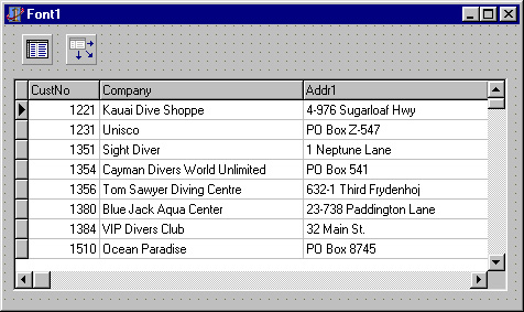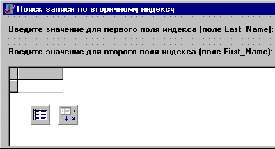 Поиск данных В наборе данных реализованы два способа поиска записей по заданным значениям полей. Один способ основан на использовании индексов и является более быстрым, но поиск проводится только по индексированным полям. Второй способ использует специальные методы класса TBDEDataSet и позволяет проводить поиск по любому сочетанию полей, но он более медленный. Поиск по индексам Для организации индексного поиска к набору данных должен быть подключен инднкс (свойства IndexName или IndexFieldNames). Метод FindKey проводит поиск записи по заданным в параметре значениям ключевых полей текущего индекса набора данных. В случае успеха курсор набора данных устанавливается на найденной записи, а метод возвращает значение True. В противном случае возвращается False. Если индекс состоит из нескольких полей, значения для поиска записываются в виде множества, причем отсутствующие значения приравниваются к Null. Рассмотрим простейший пример, в котором реализован поиск по вторичному индексу в таблице CUSTOLY.DB демонстрационной базы данных DBDEMOS. Индекс основан на полях Last_Name и FirstJName (рис. 18.8).
