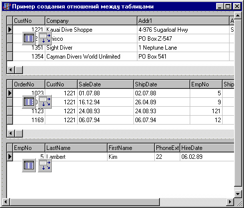 Рис. 18.4. Главная форма проекта DemoJoins В качестве примера рассмотрим проект DemoJoins (рис. 18.4), в котором связываются таблицы из демонстрационной базы данных DBDEMOS. Таблица Customers представлена в наборе данных компонента custTabie, она содержит данные о покупателях. Таблица Orders представлена в наборе данных компонента ОrdTable, она содержит данные о заказах. Таблица Employee представлена в наборе данных компонента EmpTabie, она содержит данные о продавцах. Приложение DemoJoins не содержит дополнительного исходного кода. Все отношения между таблицами заданы при помощи Инспектора объектов. Отношение "один ко многим" задано между таблицами покупателей (Customers) и заказов (Orders). Таблица покупателей является главной. Для создания отношения установлены следующие значения свойств компонента OrdTable (подчиненная таблица). Свойство MasterSource должно указывать на компонент custsource, связанный с набором данных CustTabie. Свойство MasterFieids указывает на поле custNo таблицы Customers. В наборе данных ordTable включен вторичный индекс на основе поля CustNo (indexName = 'CustNo'). Таким образом, две таблицы связаны отношением "один ко многим" по индексированным полям CustNo (номер покупателя). В результате, при перемещении по записям таблицы покупателей, в таблице заказов будут показаны только те заказы, которые относятся к текущему покупателю. Отношение "многие ко многим" Отношение "многие ко многим" отличается тем, что подчиненная таблица еще раз связывается в качестве главной с другой подчиненной таблицей аналогичной последовательностью действий, как и в отношении "один ко многим". В приложении DemoJoins отношением "многие ко многим" связаны таблицы заказов (Orders) и продавцов (Employee). Таблица заказов уже работает в отношении "один ко многим" в качестве подчиненной. В наборе данных EmpTable заданы следующие свойства. Свойство MasterSource указывает на компонент Empsource. Свойство MasterFields содержит имя поля EmpNo, по которому осуществляется связь между таблицами. Для подчиненной таблицы поле EmpNo является первичным Навигация по набору данных Перемещение или навигация по записям набора данных может осуществляться несколькими путями. Например, в компонентах TDBGrid и TDBCtriGrid, которые отображают сразу несколько записей набора данных, можно использовать клавиши вертикального перемещения курсора или вертикальную полосу прокрутки. Но что делать, если на форме расположены только компоненты, отображающие одно поле только текущей записи набора данных (TDBEdit, TDBComboBox и т. д.)? Очевидно, что в этом случае на форме должны быть расположены дополнительные элементы управления, отвечающие за перемещение по записям. Аналогично, ни один компонент отображения данных не имеет встроенных средств для создания и удаления записей целиком. Для решения указанных задач и предназначен компонент TDBNavigator, который представляет собой совокупность управляющих кнопок, выполняет операции навигации по набору данных и модификации записей целиком. Компонент TDBNavigator при помощи свойства DataSource связывается с компонентом TDataSource и через него с набором данных. Такая схема позволяет обеспечить изменение текущих значений полей сразу во всех связанных с TDataSource компонентах отображения данных. Таким образом, TDBNavigator только дает команду на выполнение перемещения по набору данных или другой управляющей операции, а всю реальную работу выполняют BDE, компонент набора данных и компонент TDataSou