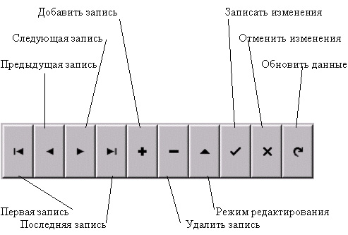 Рис. 18.5. Назначение кнопок компонента TDBNavigator Компонент TDBNavigator содержит набор кнопок (рис. 18.5), каждая из которых отвечает за выполнение одной операции с набором данных. Всего имеется 10 кнопок, разработчик может оставить в наборе любое количество кнопок в любом сочетании. Видимостью кнопок управляет свойство visibleButtons: type TNavigateBtn - (nbFirst, nbPrior, nbNext, nbLast, nblnsert, nbDelete, nbEdit, nbPost, nbCancel, nbRefresh); TButtonSet = set of TNavigateBtn; property VisibleButtons: TButtonSet; Каждый элемент типа TNavigateBtn представляет одну кнопку, их назначение описывается ниже.