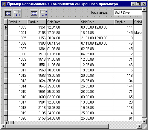 В качестве примера рассмотрим приложение DemoLookup (рис. 18.6), в котором с набором данных таблицы Orders из базы данных DBDEMOS связаны компоненты TDBGrid и TDBLookupComboBox. Во втором компоненте при перемещении по записям набора данных отображается имя покупателя, оформившего текущий заказ.
