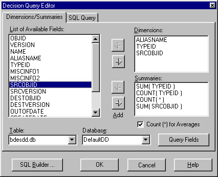 Компонент TDecisionQuery должен только обеспечить выполнение запроса и создание набора данных, поэтому он не имеет никаких дополнительных свойств или методов. Поэтому для создания набора данных можно использовать и обычный компонент TQuery. Преимущество компонента TDecisionQuery состоит в том, что он имеет специализированный редактор для создания текста запроса (рис. 23.1). Он вызывается командой Decision Query Editor из всплывающего меню компонента или двойным щелчком на компоненте.
