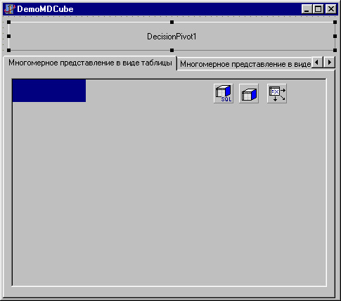 Для этого в форме приложения требуется разместить как минимум пять компонентов со страницы Decision Cube Палитры компонентов. Для создания запроса SQL можно использовать компонент TDecisionQuery или.обычный компонент TQuery. Запрос должен быть связан с компонентом TDecisionCube, который осуществляет подготовку набора данных запроса к показу. Для соединения многомерного набора данных с компонентом отображения данных используется компонент TDecisionSource — полный функциональный аналог TDataSource. Этот компонент, в свою очередь, должен связываться и с набором данных, и с инструментом многомерного представления данных. Непосредственный показ многомерного набора данных проводится при помощи компонентов TDecisionGrid или TDecisionGraph. Они должны поддерживать соединение с компонентом TDesicionSource. Наконец, управление многомерным представлением данных реализует компонент TDecisionpivot, он также должен быть связан с компонентом TDecisionSource. Допустим, что в форме расположены следующие компоненты: