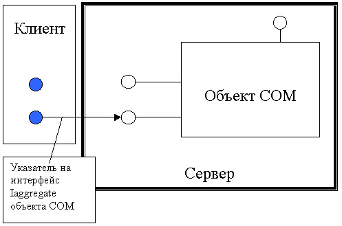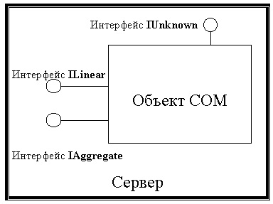 Рис. 26.1. Сервер, объект и его интерфейсы Согласно правилам обозначения объектов СОМ, базовый интерфейс lUnknown (см. ниже), который имеется у любого объекта, обозначается как кружок, примыкающий к верхней стороне прямоугольника объекта. Остальные интерфейсы обозначаются справа или слева.