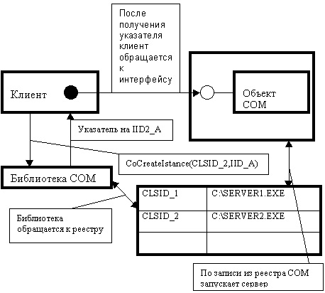 Предположим, что клиент пытается использовать некоторый объект СОМ, который до этого момента не использовался. Следовательно, клиент не имеет указателя на нужный объект и интерфейс. В этом случае он обращается к библиотеке СОМ и вызывает метод CoCreateInstance, передавая ей в качестве параметра CLSID нужного класса, IID интерфейса и требуемый тип сервера. Библиотека при помощи диспетчера управления службами (Service Control Manager, SCM) обращается к системному реестру, по идентификатору класса находит информацию о сервере и запускает его. Сервер создает экземпляр класса — объект и возвращает библиотеке указатель на запрошенный интерфейс.