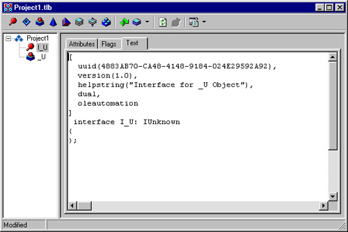 Рис. 26.5. Редактор библиотеки типов Разработчик может использовать или не использовать библиотеку типов в проекте по собственному желанию. Для включения библиотеки типов в проект при создании нового объекта СОМ необходимо установить флажок Include Type Library (рис. 26.6). Редактор библиотеки типов предоставляет разработчику полный набор инструментов, позволяя автоматизировать процесс создания объектов и интерфейсов. Окно Редактора разделено на три основные части. Вверху расположена узкая панель инструментов. При помощи кнопо^к панели можно создавать новые элементы СОМ и выполнять общие для всей библиотеки операции. Панель разделена на четыре части. Слева расположены кнопки новых типов, которые можно добавлять к библиотеке типов: