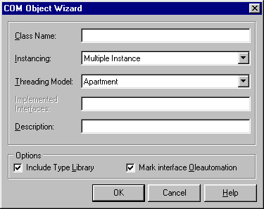 Рис. 26.6. Диалог установки начальных параметров объекта СОМ Однострочный редактор Class Name должен содержать имя нового класса. Комбинированный список Instancing определяет способ создания объекта:
