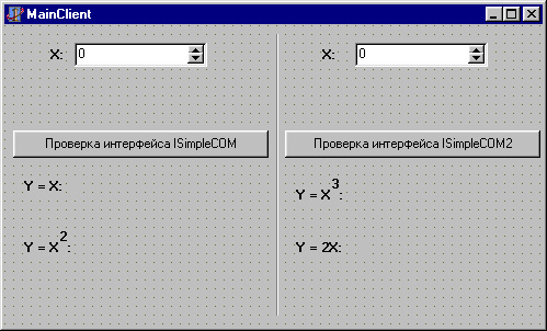 Листинг 26.5 Исходный код библиотеки типов после создания unit InProcCOM_TLB; interface uses Windows, ActiveX, Classes, Graphics, OleCtrls, StdVCL; const LIBID_InProcCOM: TGUID = '{46E48DBC-77E7-11D2-80F3-008048A9D587}'; IID_ISimpleCOM: TGUID = '{46E48DBD-77E7-11D2-80F3-008048A9D587}'; IID_ISimpleCOM2: TGUID = '(46E48DC1-77E7-11D2-80F3-008048A9D587}'; CLASS_SirnpleCOM: TGUID = '{46E48DBF-77E7-11D2-80F3-008048A9D587}'; tyре ISimpleCOM = interface; ISimpleCOM2 = interface; ISirripleCOM2Disp = dispinterface; ISimpleCOM = ISimpleCOM; ISimpleCOM = interface(lUnknown) ['{46E48DBD-77E7-11D2-80F3-008048A9D587}'] function LinearX(AValue: Integer): Integer; stdcall; function SquareX(AValue: Integer): Integer; stdcall; end; ISimpleCOM2 = interface(lUnknown) ['{46E48DC1-77E7-11D2-80F3-008048A9D587}'] function Linear2X(AValue: Integer): Integer; safecall; function CubeX(AValue: Integer): Integer; safecall; end; ISimpleCOM2Disp = dispinterface ['{46E48DC1-77E7-11D2-80F3-008048A9D587}'] function Linear2X(AValue: Integer): Integer; dispid 1; function CubeX(AValue: Integer): Integer; dispid 2; end; CoSimpleCOM = class class function Create: ISimpleCOM; class function CreateRemote(const MachineName: string): ISimpleCOM; end; implementation uses ComObj; class function CoSimpleCOM.Create: ISimpleCOM; begin Result := CreateComObject;CLASS_SimpleCOM) as ISimpleCOM; end; class function CoSimpleCOM.CreateRemote(const MachineName: string): ISimpleCOM; begin Result := CreateRemoteComObject(MachineName, CLASS_SimpleCOM) as TSim-pleCOM; end; end. Рассмотрим теперь изменения в библиотеке типов. Во-первых, в библиотеке появилось объявление второго интерфейса ISimpleCOM2. Во-вторых, созданные методы объявлены в соответствующих интерфейсах. После завершения разработки объекта и компиляции библиотеки необходимо зарегистрировать ее в качестве сервера. Для этого используется команда Register ActiveX Server меню Run Главного окна Delphi. После вызова объекта такая динамическая библиотека подгружается в адресное пространство клиентского приложения и работает как внутренний сервер. На этом создание объекта SimplecoM закончено, можно переходить к клиентской части проекта. Ее роль сыграет простое приложение ClientInProcCOM с единственной формой MainClient. Необходимо настроить ее таким образом, чтобы можно было протестировать работу двух интерфейсов созданного объекта (рис. 26.7). Компоненты TSpinEdit предназначены для задания значения Х для функций. Кнопки должны вызывать соответствующие методы интерфейсов объекта. Для отображения результата использованы компоненты TLabel.