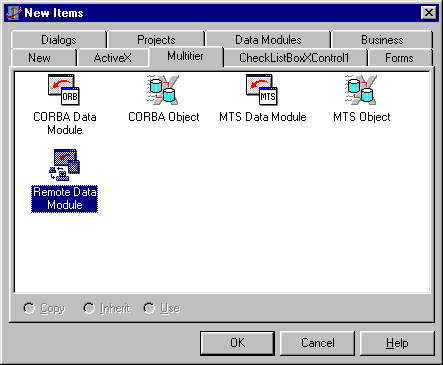 Удаленный модуль данных При создании удаленного модуля данных необходимо указать, как он должен отвечать на клиентские запросы. Эта информация изменяется в зависимости от типа удаленного модуля данных. Чтобы добавить компонент TRemoteDataModule к приложению, надо выбрать пункт New меню File и затем значок Remote Data Module со страницы Multitier (рис. 29.1).