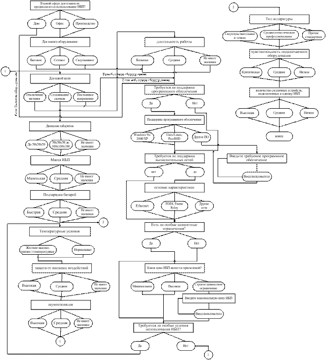 Путем задавания наводящих вопросов о сфере применения ИБП, целях его приобретения и ограничениях на внешние параметры и цену ИБП выявляются необходимые для выбора параметры. После чего на основе этих параметров мы получаем те или иные атрибуты в соответствии с определенными в базе знаний правилами. А после этого на основе атрибутов с учетом некоторой их приоритетности принимается решение по выбору того или иного объекта, т.е. в нашем случае конкретной модели источника бесперебойного питания.