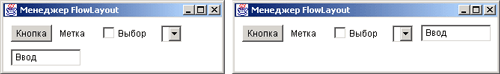 В предыдущей главе мы размешали компоненты "вручную", задавая их размеры и положение в контейнере абсолютными координатами в координатной системе контейнера. Для этого мы применяли метод setBounds(). Такой способ размешает компоненты с точностью до пиксела, но не позволяет перемещать их. При изменении размеров окна с помощью мыши компоненты останутся на своих местах, привязанными к левому верхнему углу контейнера. Кроме того, нет гарантии, что все мониторы отобразят компоненты так, как вы задумали. Чтобы учесть изменение размеров окна, надо задать размеры и положение компонента относительно размеров контейнера, например, так: int w = getSizef).width; // Получаем ширину int h = getSizeO.height; //и высоту контейнера Button Ь = new Button("OK"); // Создаем кнопку b.setBounds(9*w/20, 4*h/5, w/10, h/10); и при всяком изменении размеров окна задавать расположение компонента заново. Чтобы избавить программиста от этой кропотливой работы, в библиотеку AWT внесены два интерфейса: LayoutManager и порожденный от него интерфейс LayoutManager2, а также пять реализаций этих интерфейсов: классы BorlerLayout, CardLayout, FlowLayout, GridLayout И GridBagLayout. Эти классы названы менеджерами размещения (layout manager) компонентов. Каждый программист может создать свои менеджеры размещения, реализовав интерфейсы LayoutManager или LayoutManager2. Посмотрим, как размещают компоненты эти классы. Наиболее просто поступает менеджер размещения FlowLayout. Он укладывает в контейнер один компонент за другим слева направо как кирпичи, переходя от верхних рядов к нижним. При изменении размера контейнера "кирпичи" перестраиваются, как показано на рис. 11.1. Компоненты поступают в том порядке, в каком они заданы в методах add (). В каждом ряду компоненты могут прижиматься к левому краю, если в конструкторе аргумент align равен FlowLayout. LEFT, к правому краю, если этот аргумент FlowLayout. RIGHT, или собираться в середине ряда, если FlowLayout.CENTER. Между компонентами можно оставить промежутки (gap) по горизонтали hgap и вертикали vgap. Это задается в конструкторе: FlowLayout(int align, int hgap, int vgap) Второй конструктор задает промежутки размером 5 пикселов: FlowLayout(int align) Третий конструктор определяет выравнивание по центру и промежутки 5 пикселов: FlowLayout() После формирования объекта эти параметры можно изменить методами: setHgapfint hgap) setVgap(int vgap) setAlignment(int align) В листинге 11.1 создаются кнопка Button, метка Label, кнопка выбора checkbox, раскрывающийся список choice, поле ввода TextFieid и все это размещается в контейнере Frame. Рис. 11.1 содержит вид этих компонентов при разных размерах контейнера. Листинг 11.1. Менеджер размещения FlowLayout import j ava.awt.*; import j ava.awt.event.*; class FlowTest extends Frame{ FlowTest(String s) { super(s); setLayout (new FlowLayout (FlowLayout.LEFT, 10, 10)); add(new Button("Кнопка")); add(new Label("Метка")); add(new Checkbox("Выбор")); add(new Choice()); add(new TextFieldt"Справка", 10)); setSize(300, 100); setVisible(true); } public static void main(String[] args){ Frame f= new FlowTest(" Менеджер FlowLayout"); f.addWindowListener(new WindowAdapter(){ public void windowClosing(WindowEvent ev){ System.exit(0); } }); } }
